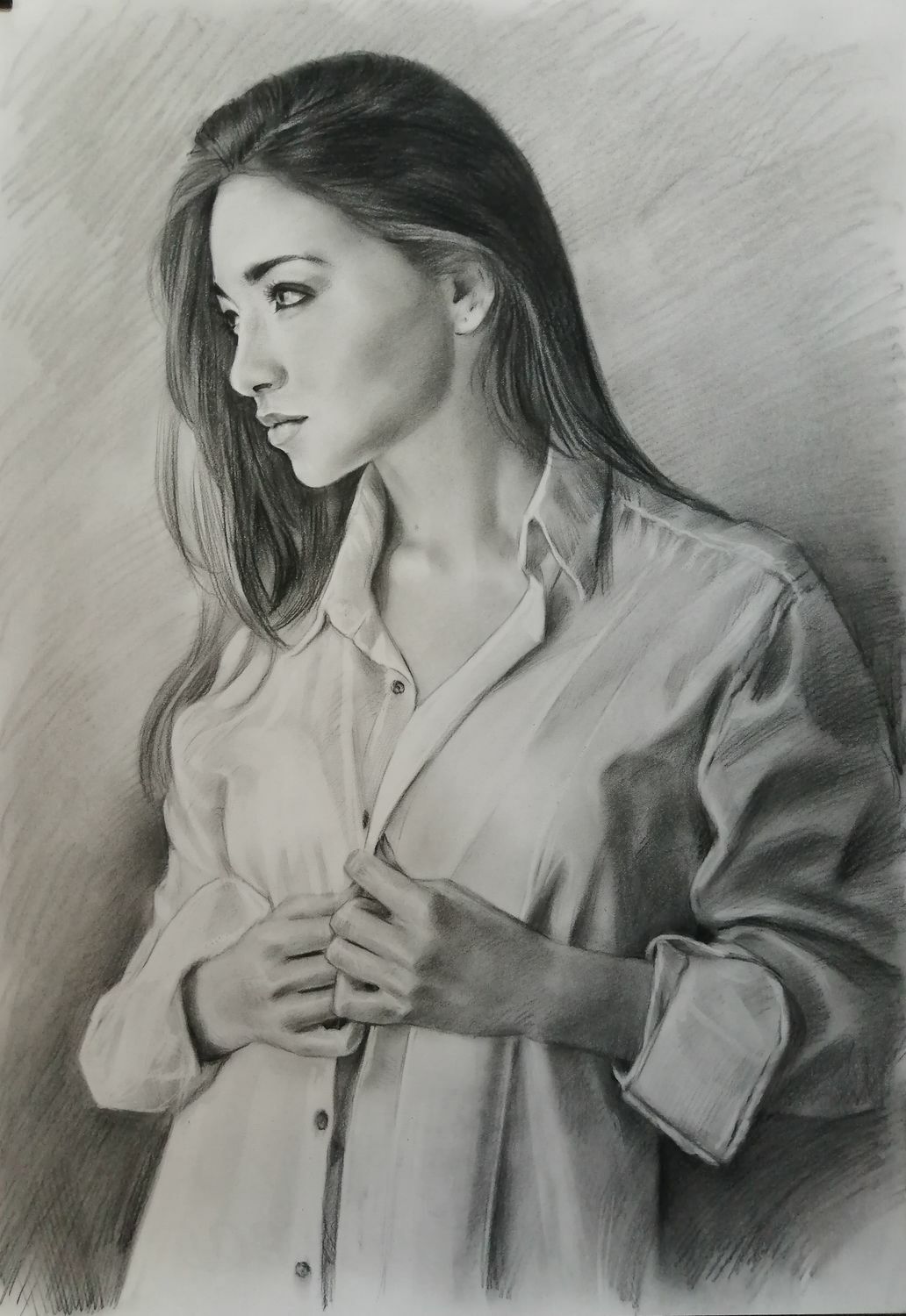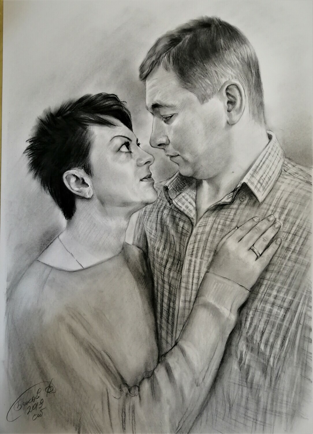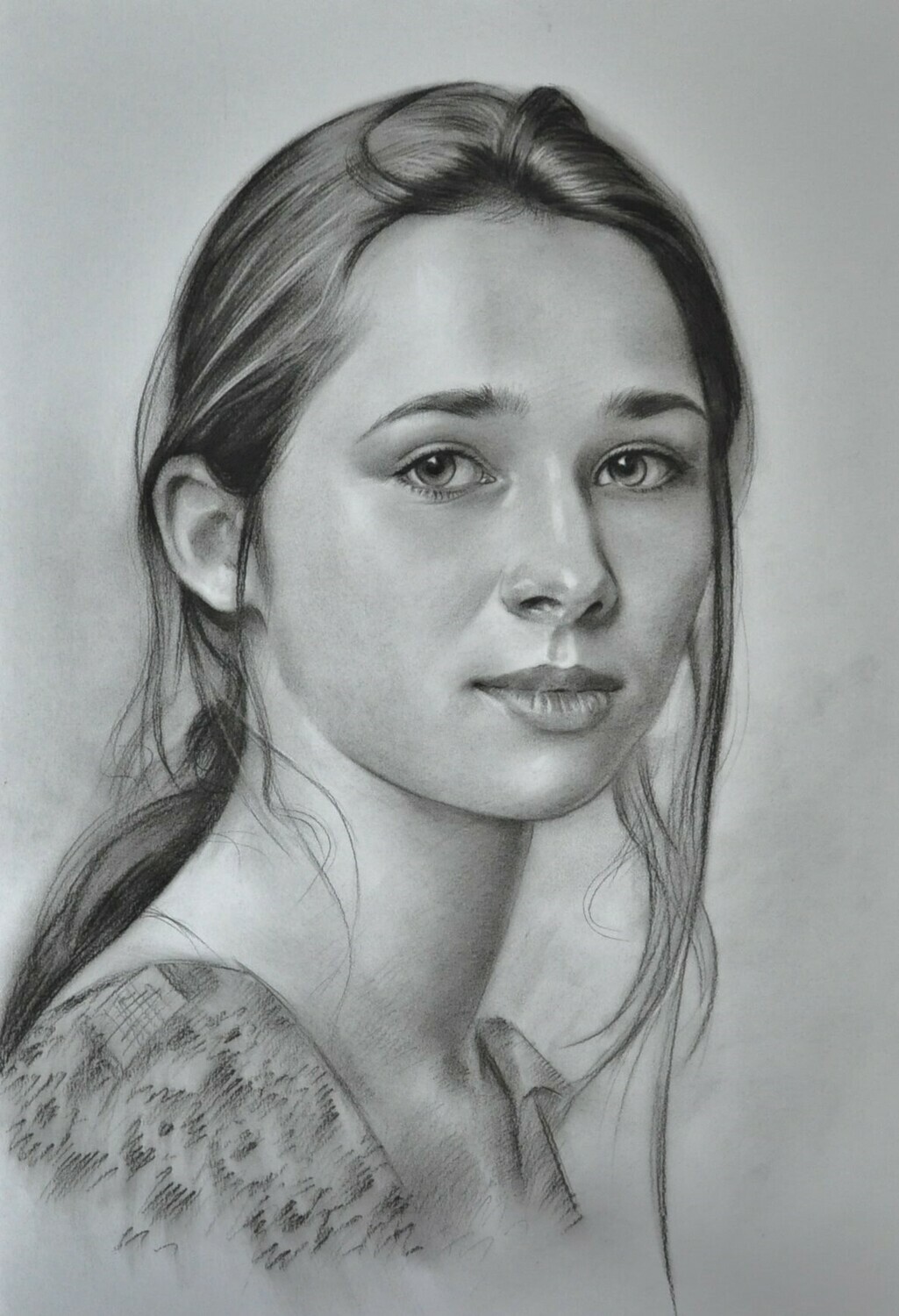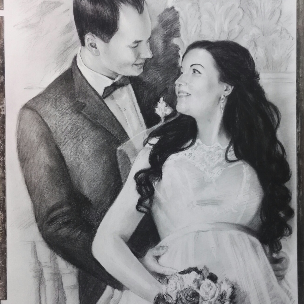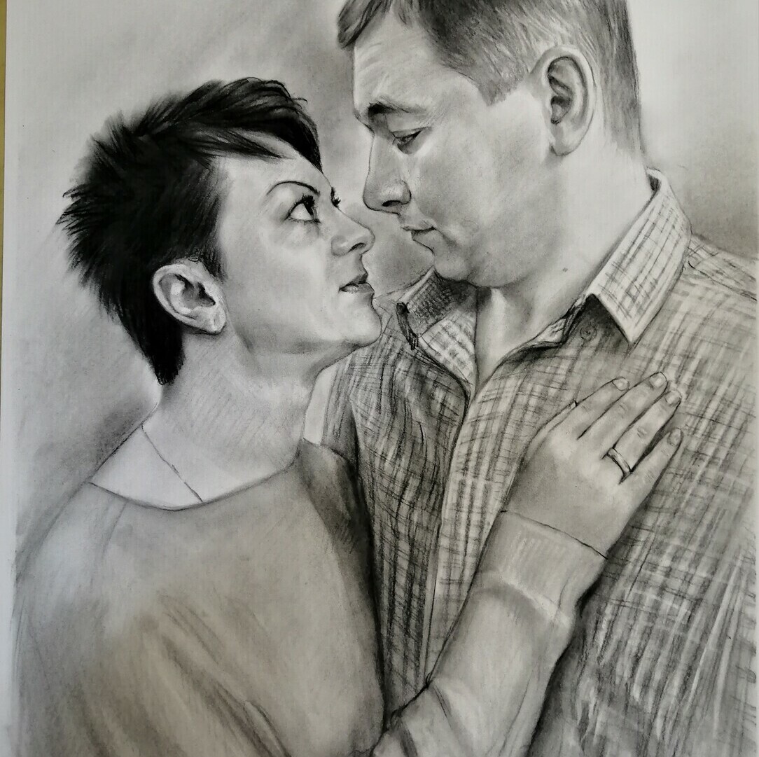 Дополнительного закрепления такой портрет не требует: он не размазывается и ведёт себя устойчиво. Оформляется просто и эстетично — как графика, под стекло в раму, что делает его практичным и удобным в уходе вариантом для дома или офиса.