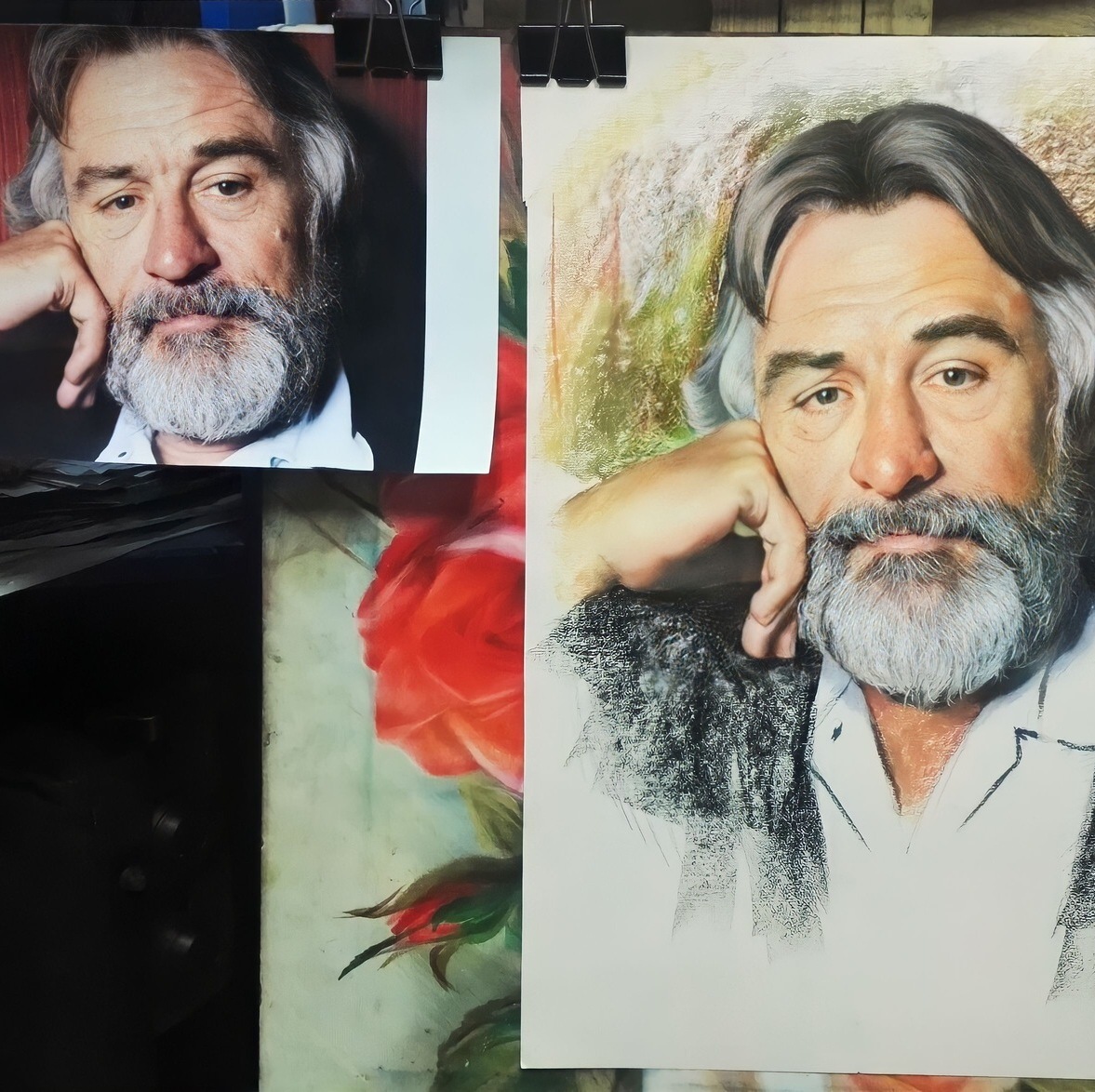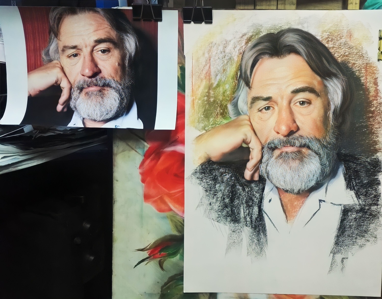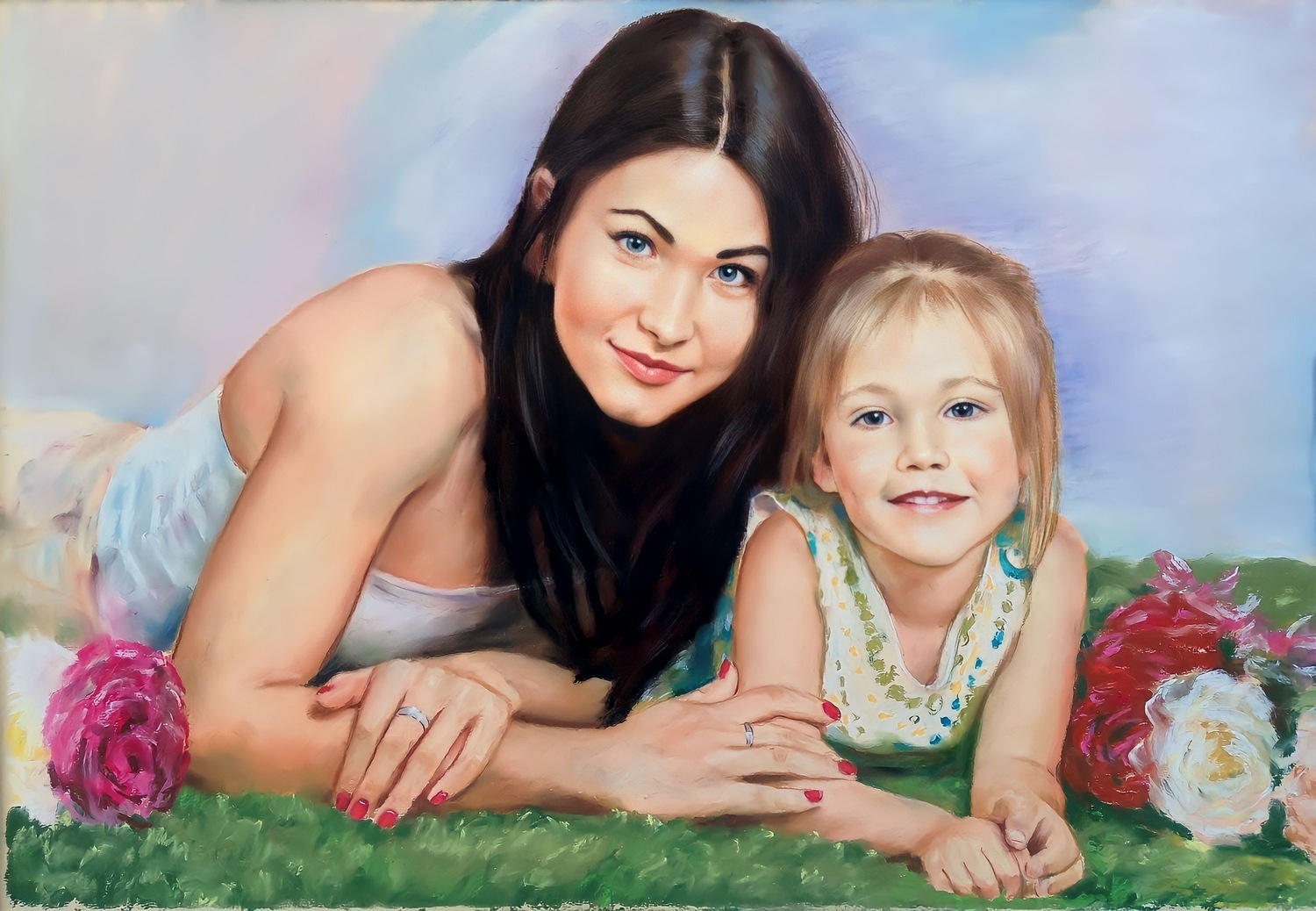 Портреты и картины пастелью выполняются на специальной фактурной бумаге, которая «держит» пигмент и помогает создать богатую поверхность. Именно фактура придаёт работе дополнительную глубину и делает изображение более живым. При необходимости мы подбираем формат и композицию так, чтобы готовая работа гармонично смотрелась в будущем оформлении.